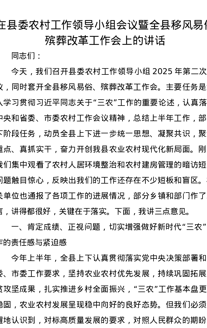 在县委农村工作领导小组会议暨全县移风易俗殡葬改革工作会上的讲话