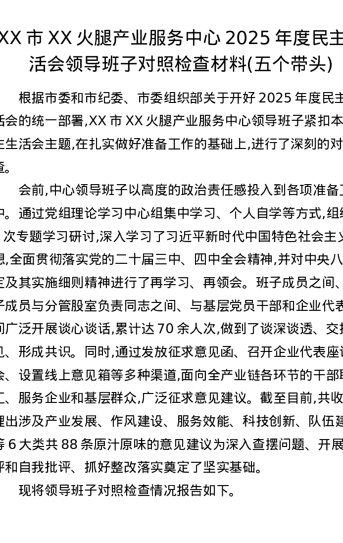 XX市XX火腿产业服务中心2025年度xxxxx领导班子对照检查材料(五个带头)