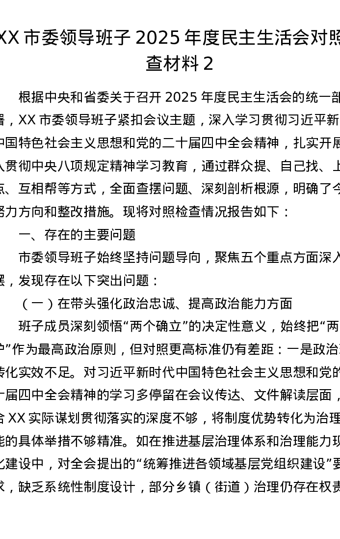 XX市委领导班子2025年度xxxxx对照检查材料2