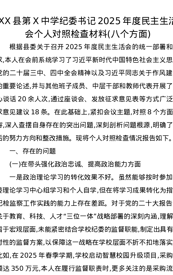 XX县第X中学纪委书记2025年度xxxxx个人对照检查材料(八个方面)