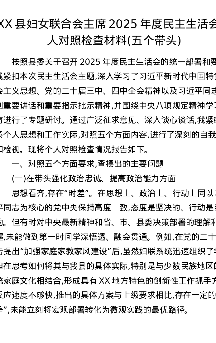 XX县妇女联合会主席2025年度xxxxx个人对照检查材料(五个带头)
