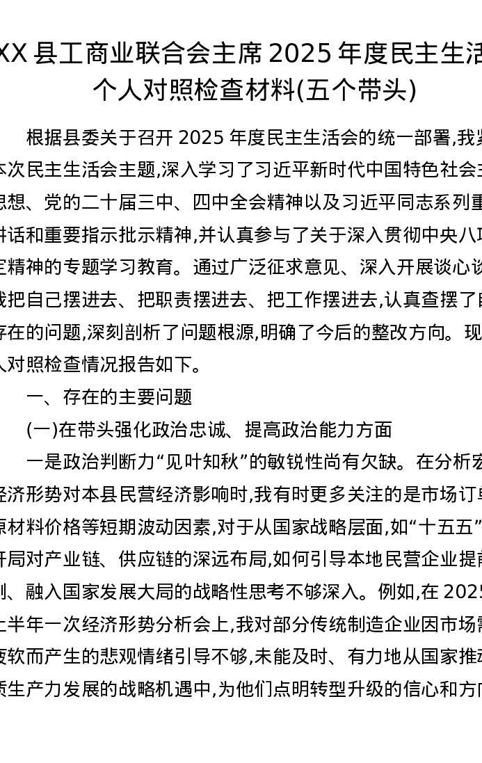 XX县工商业联合会主席2025年度xxxxx个人对照检查材料(五个带头)