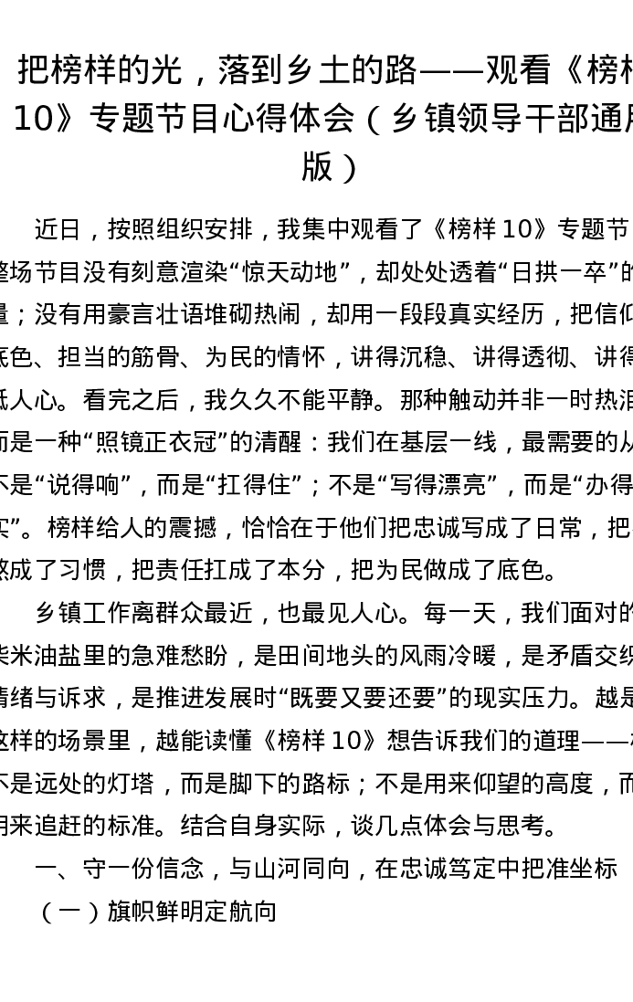把榜样的光,落到乡土的路——观看《榜样10》专题节目心得体会(乡镇领导干部通用版)