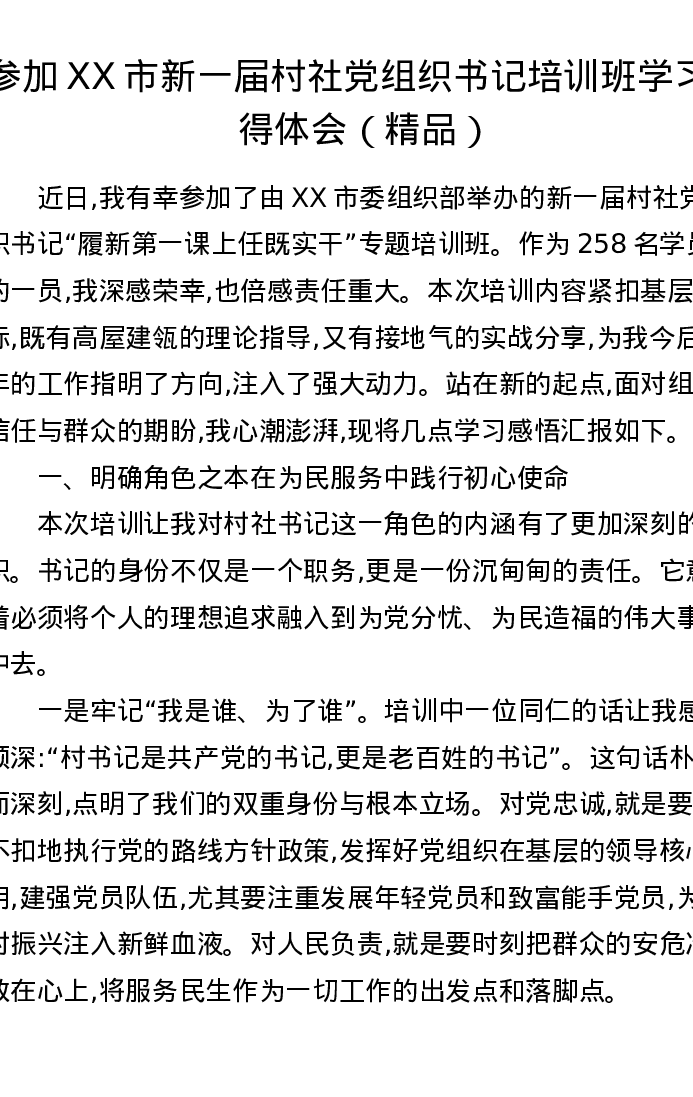 参加XX市新一届村社党组织书记培训班学习心得体会