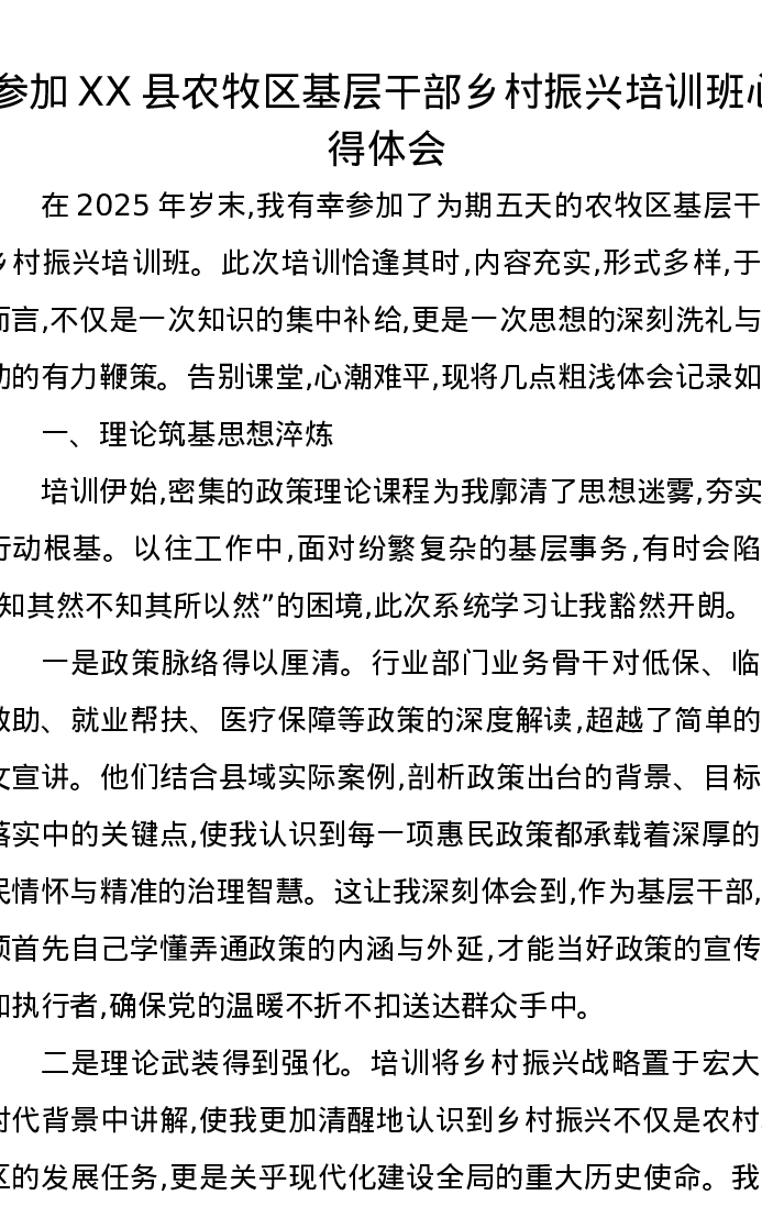 参加XX县农牧区基层干部乡村振兴培训班心得体会