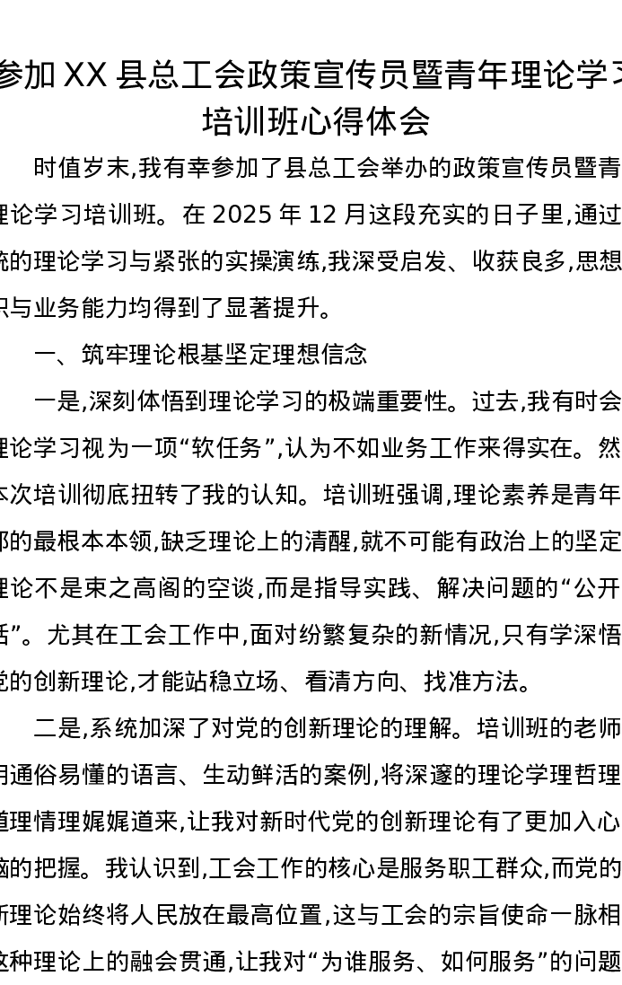 参加XX县总工会政策宣传员暨青年理论学习培训班心得体会