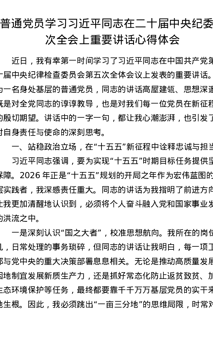 普通党员学习习近平总书记在二十届中央纪委五次全会上重要讲话心得体会