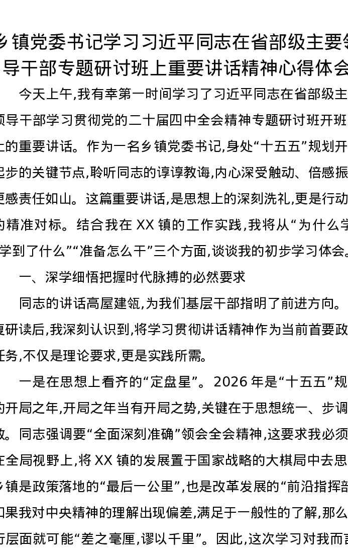 乡镇党委书记学习习近平总书记在省部级主要领导干部专题研讨班上重要讲话精神心得体会