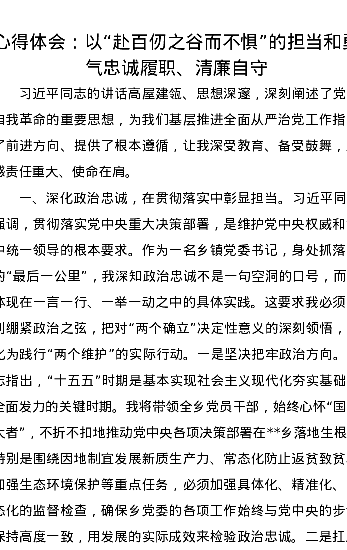心得体会:以赴百仞之谷而不惧的担当和勇气忠诚履职、清廉自守
