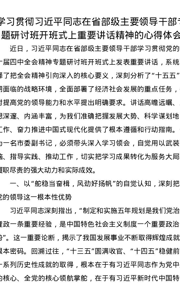 学习贯彻习近平总书记在省部级主要领导干部专题研讨班开班式上重要讲话精神的心得体会