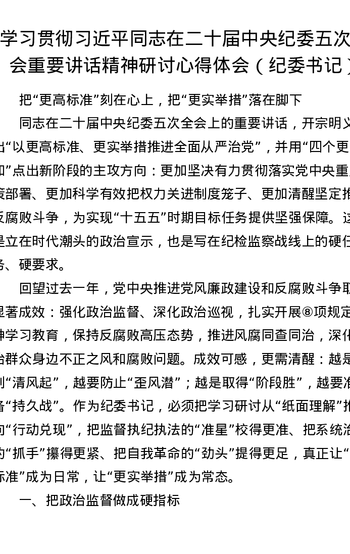 学习贯彻总书记在二十届中央纪委五次全会重要讲话精神研讨心得体会(纪委书记)