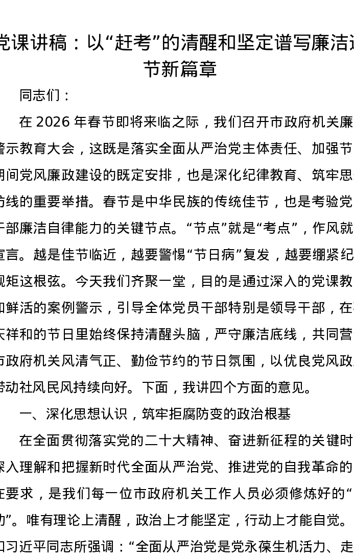 党课讲稿:以赶考的清醒和坚定谱写廉洁过节新篇章