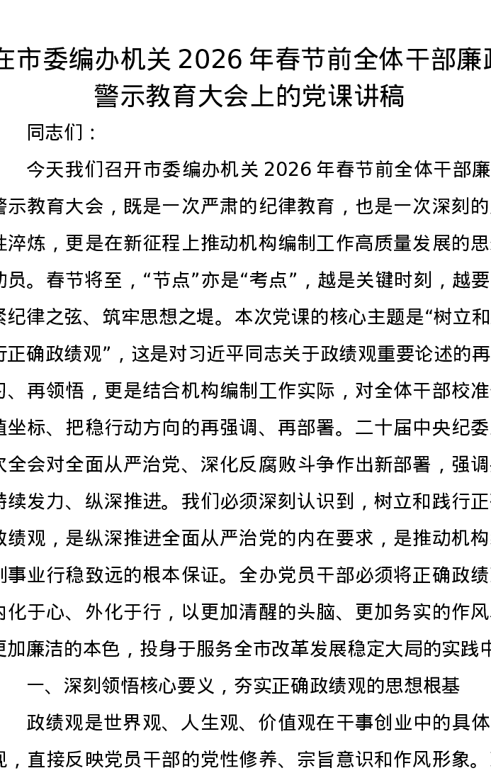 在市委编办机关2026年春节前全体干部廉政警示教育大会上的党课讲稿