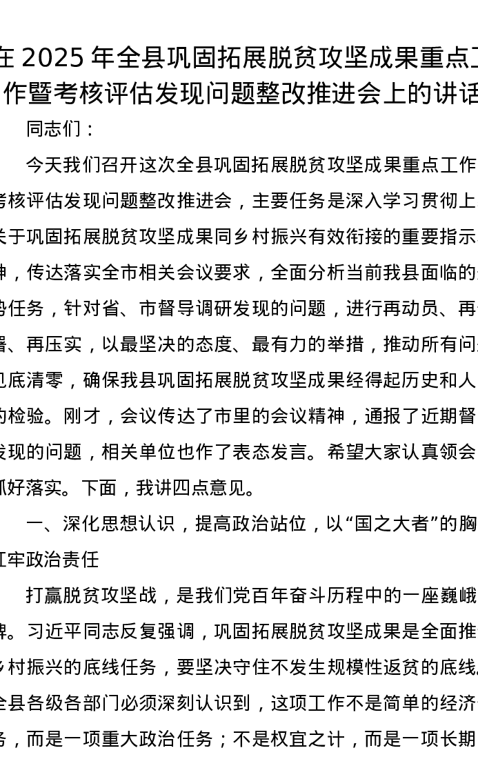 在2025年全县巩固拓展脱贫攻坚成果重点工作暨考核评估发现问题整改推进会上的讲话