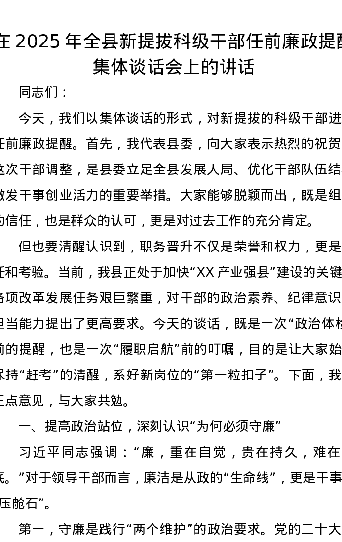 在2025年全县新提拔科级干部任前廉政提醒集体谈话会上的讲话