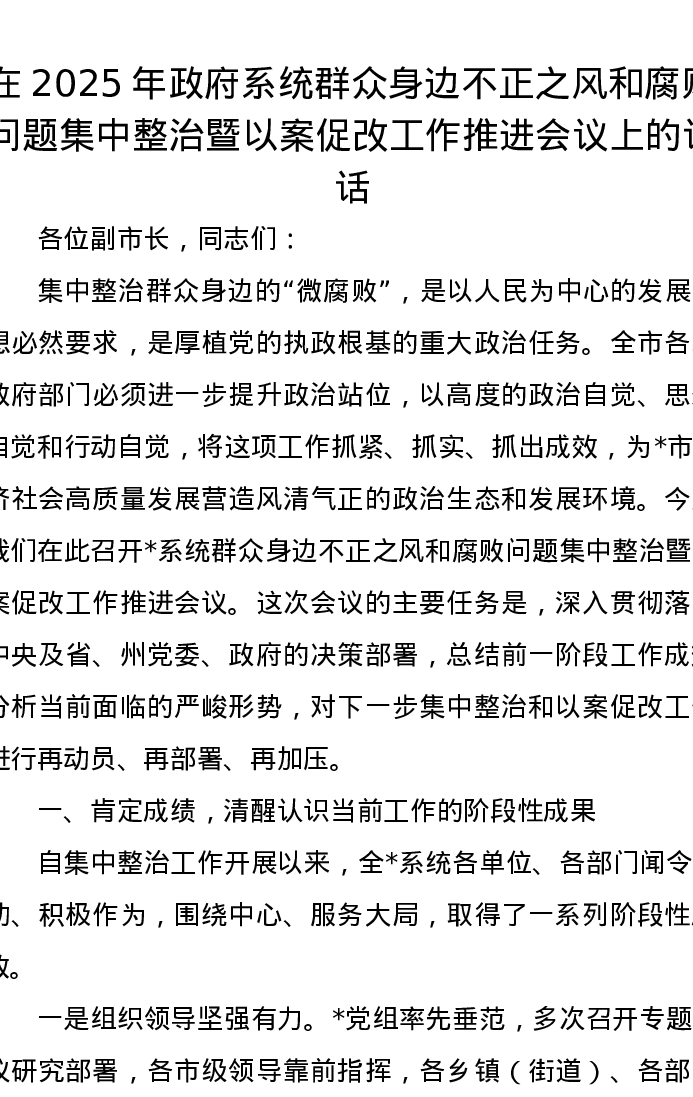 在2025年政府系统群众身边不正之风和腐败问题集中整治暨以案促改工作推进会议上的讲话
