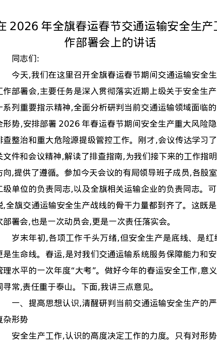 在2026年全旗春运春节交通运输安全生产工作部署会上的讲话