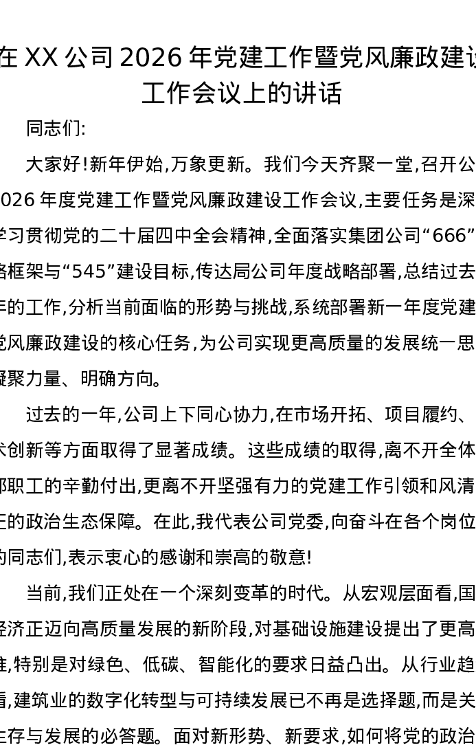 在XX公司2026年党建工作暨党风廉政建设工作会议上的讲话
