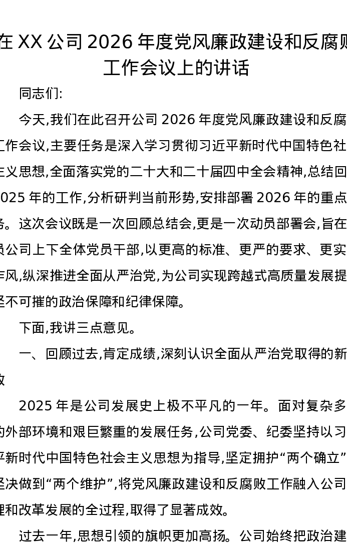 在XX公司2026年度党风廉政建设和反腐败工作会议上的讲话