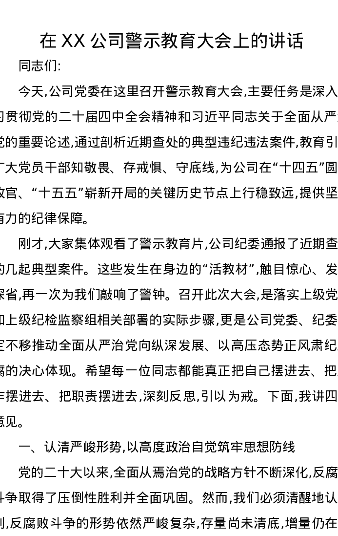 在XX公司警示教育大会上的讲话