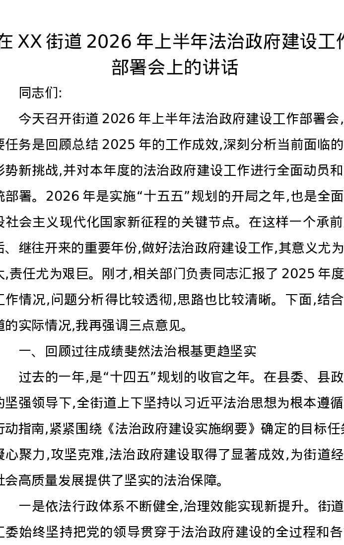 在XX街道2026年上半年法治政府建设工作部署会上的讲话