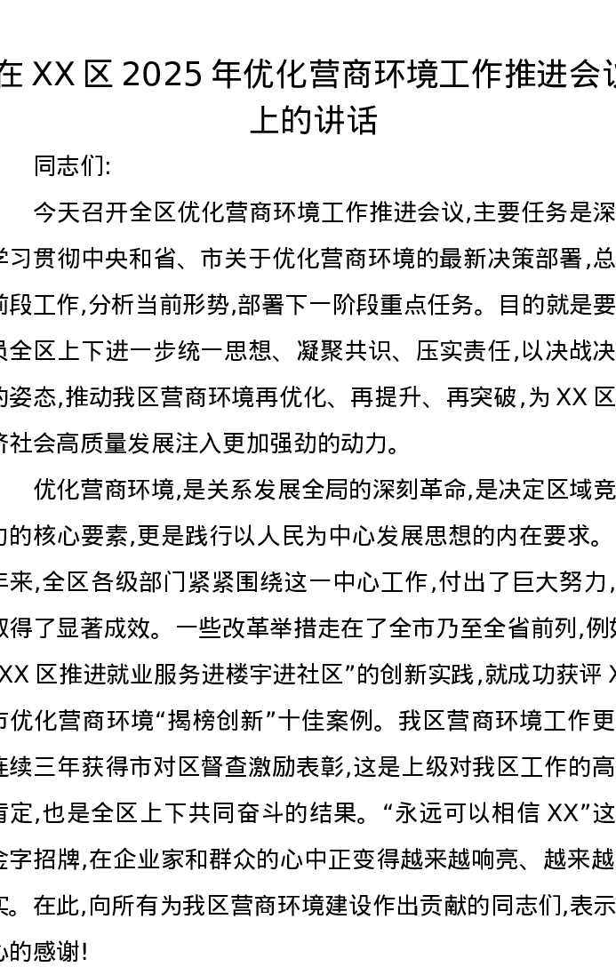 在XX区2025年优化营商环境工作推进会议上的讲话