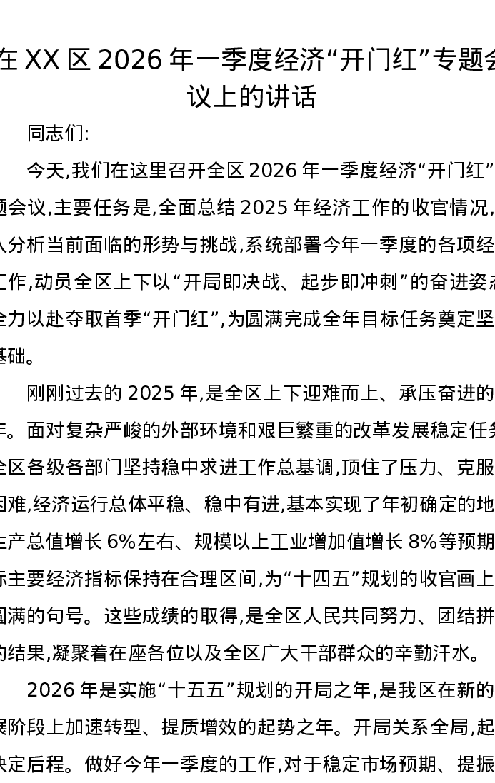 在XX区2026年一季度经济开门红专题会议上的讲话
