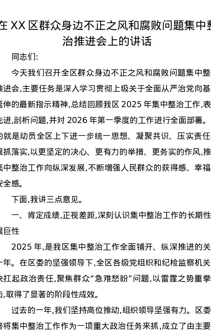 在XX区群众身边不正之风和腐败问题集中整治推进会上的讲话2