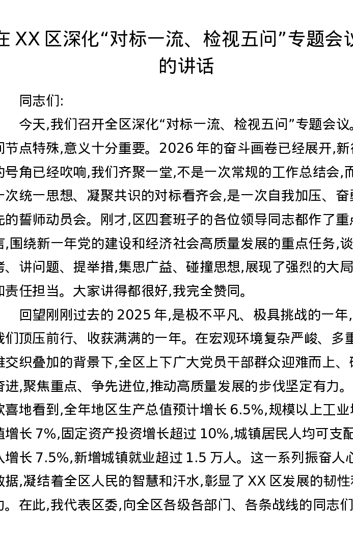 在XX区深化对标一流、检视五问专题会议上的讲话