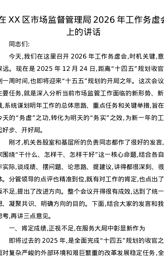 在XX区市场监督管理局2026年工作务虚会上的讲话