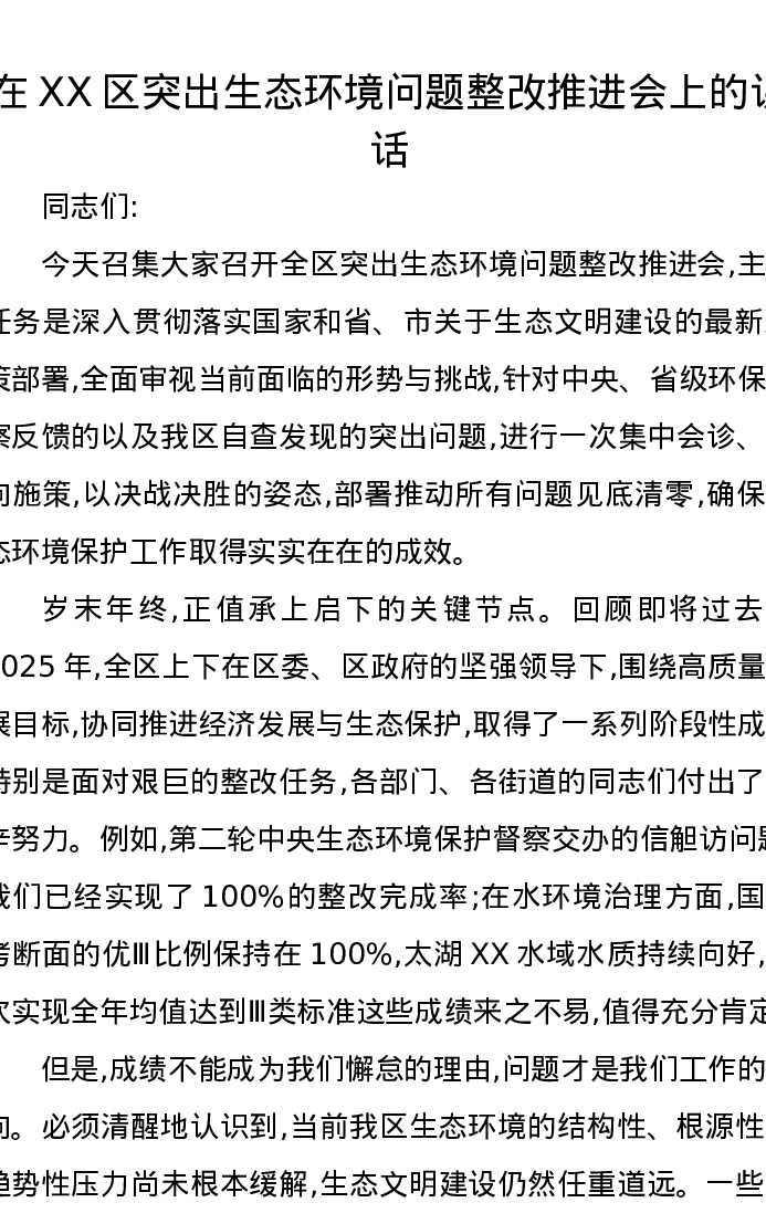 在XX区突出生态环境问题整改推进会上的讲话