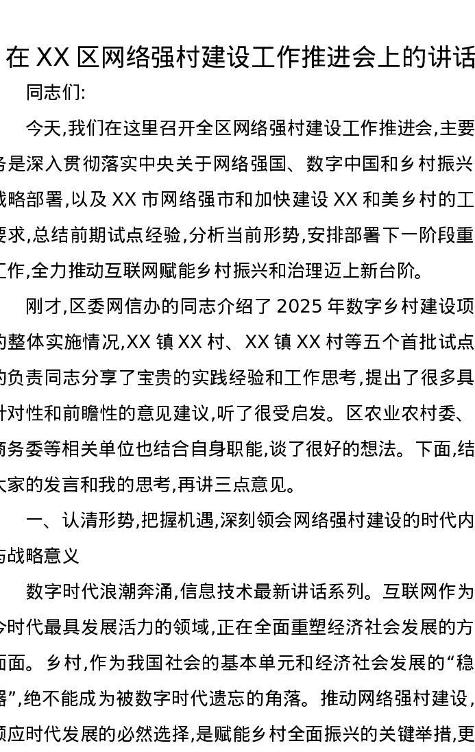 在XX区网络强村建设工作推进会上的讲话
