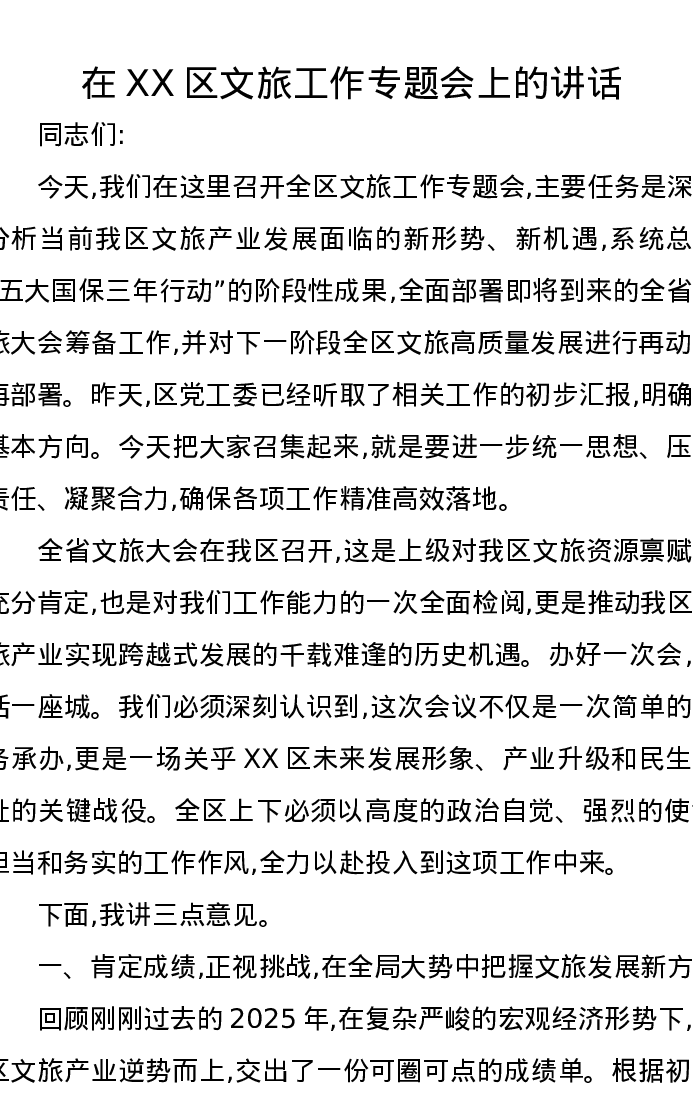 在XX区文旅工作专题会上的讲话