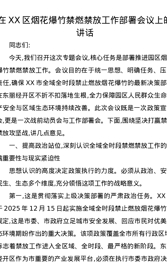 在XX区烟花爆竹禁燃禁放工作部署会议上的讲话
