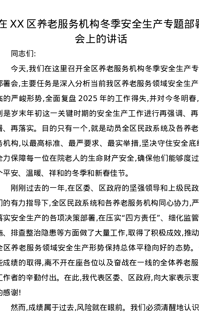 在XX区养老服务机构冬季安全生产专题部署会上的讲话