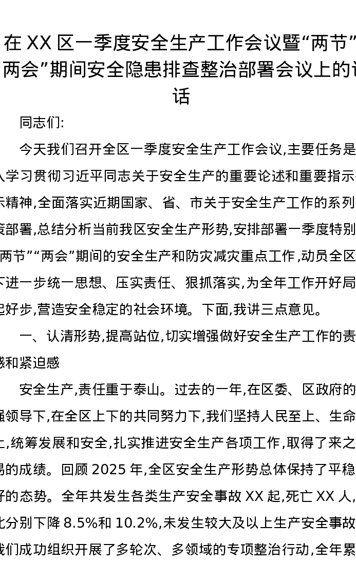 在XX区一季度安全生产工作会议暨两节两会期间安全隐患排查整治部署会议上的讲话