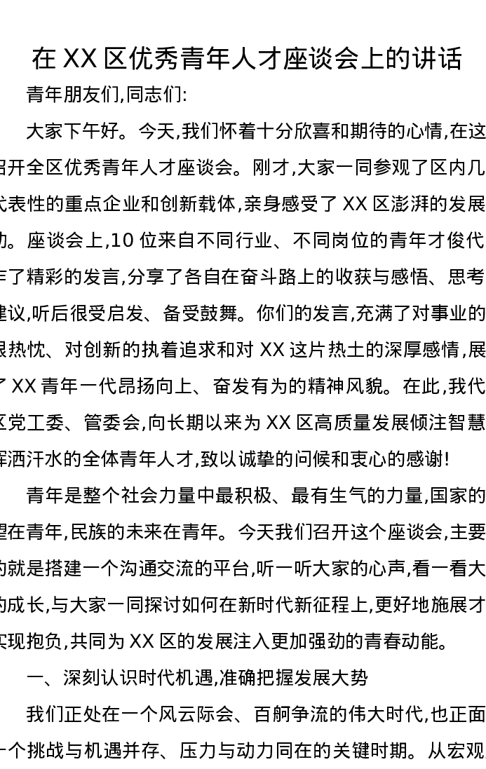 在XX区优秀青年人才座谈会上的讲话
