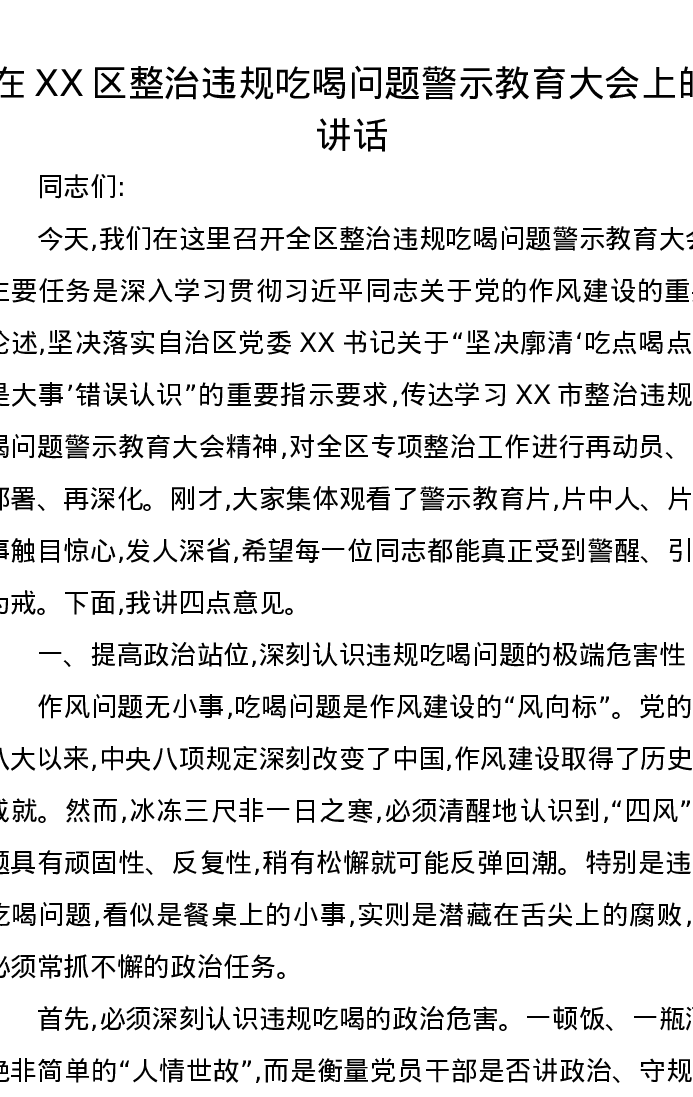 在XX区整治违规吃喝问题警示教育大会上的讲话