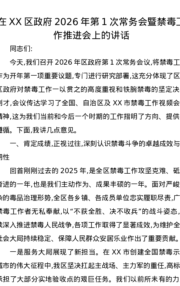 在XX区政府2026年第1次常务会暨禁毒工作推进会上的讲话