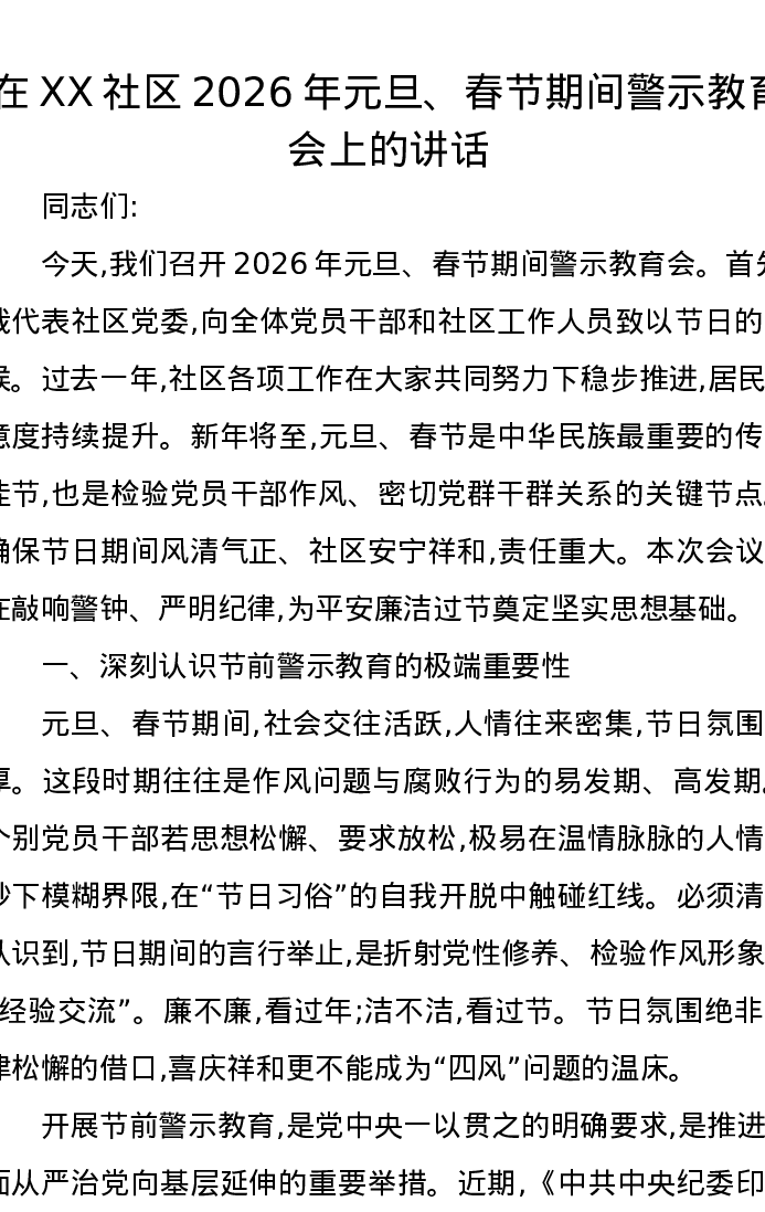 在XX社区2026年元旦、春节期间警示教育会上的讲话