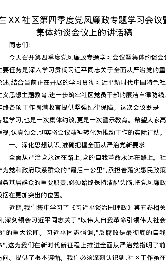 在XX社区第四季度党风廉政专题学习会议暨集体约谈会议上的讲话稿