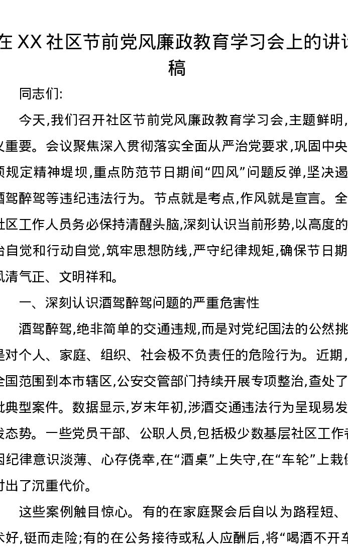 在XX社区节前党风廉政教育学习会上的讲话稿