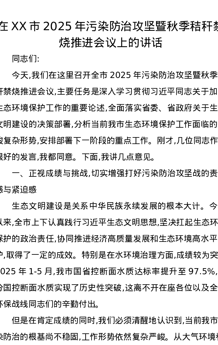 在XX市2025年污染防治攻坚暨秋季秸秆禁烧推进会议上的讲话