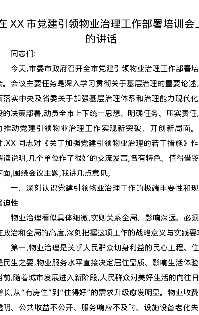在XX市党建引领物业治理工作部署培训会上的讲话