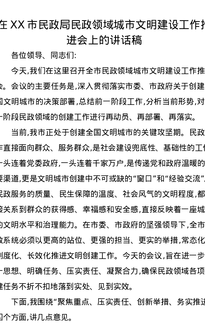 在XX市民政局民政领域城市文明建设工作推进会上的讲话稿