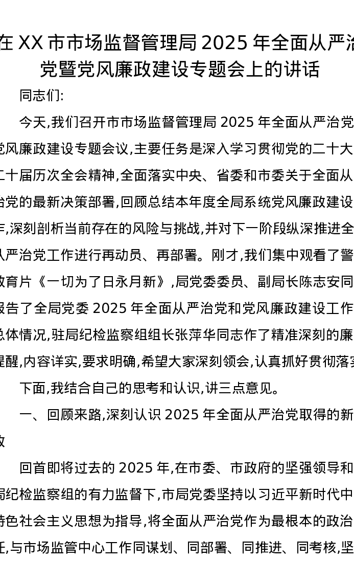 在XX市市场监督管理局2025年全面从严治党暨党风廉政建设专题会上的讲话