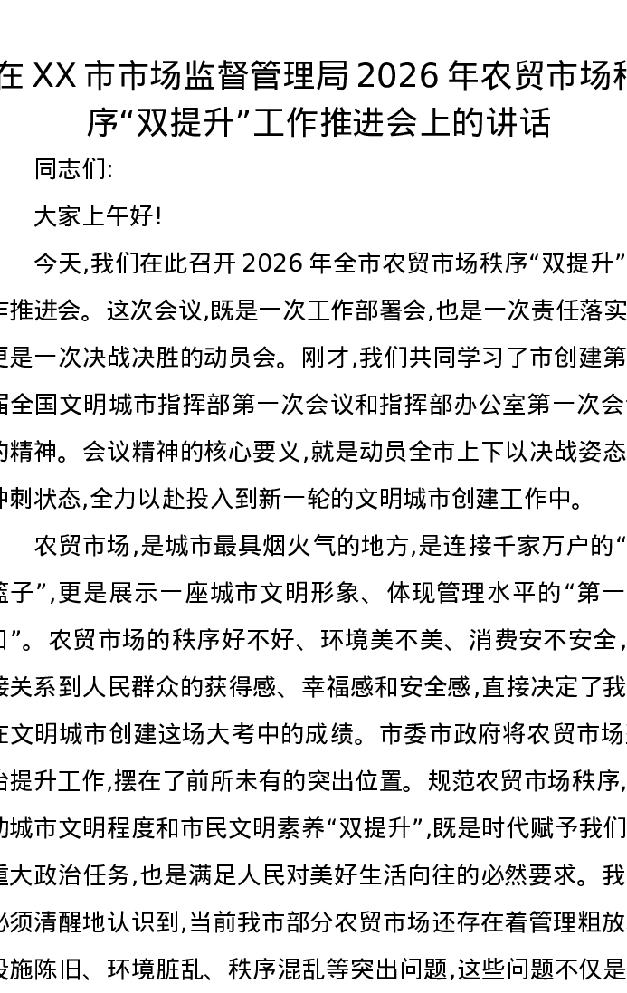在XX市市场监督管理局2026年农贸市场秩序双提升工作推进会上的讲话
