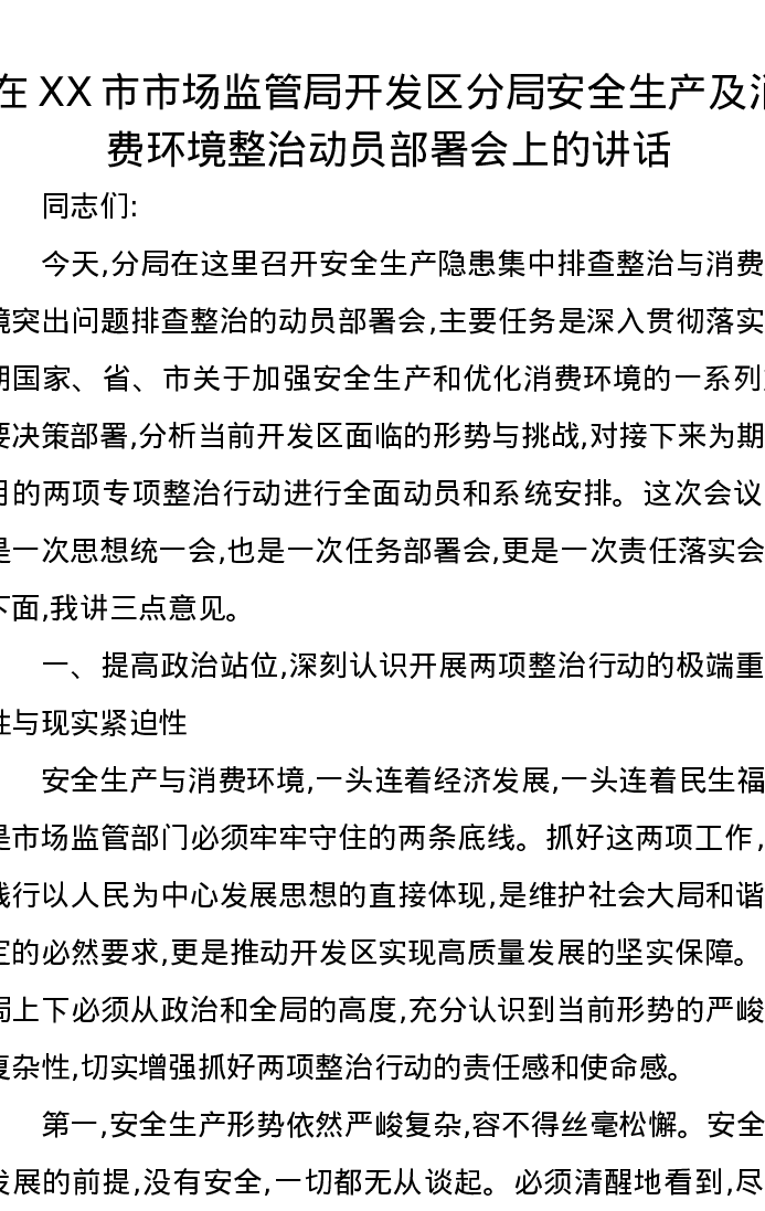 在XX市市场监管局开发区分局安全生产及消费环境整治动员部署会上的讲话