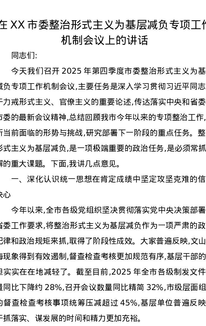 在XX市委整治形式主义为基层减负专项工作机制会议上的讲话