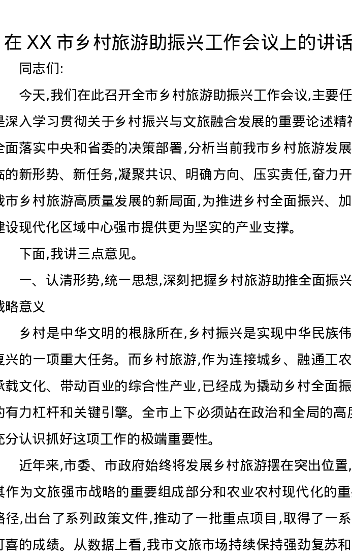在XX市乡村旅游助振兴工作会议上的讲话